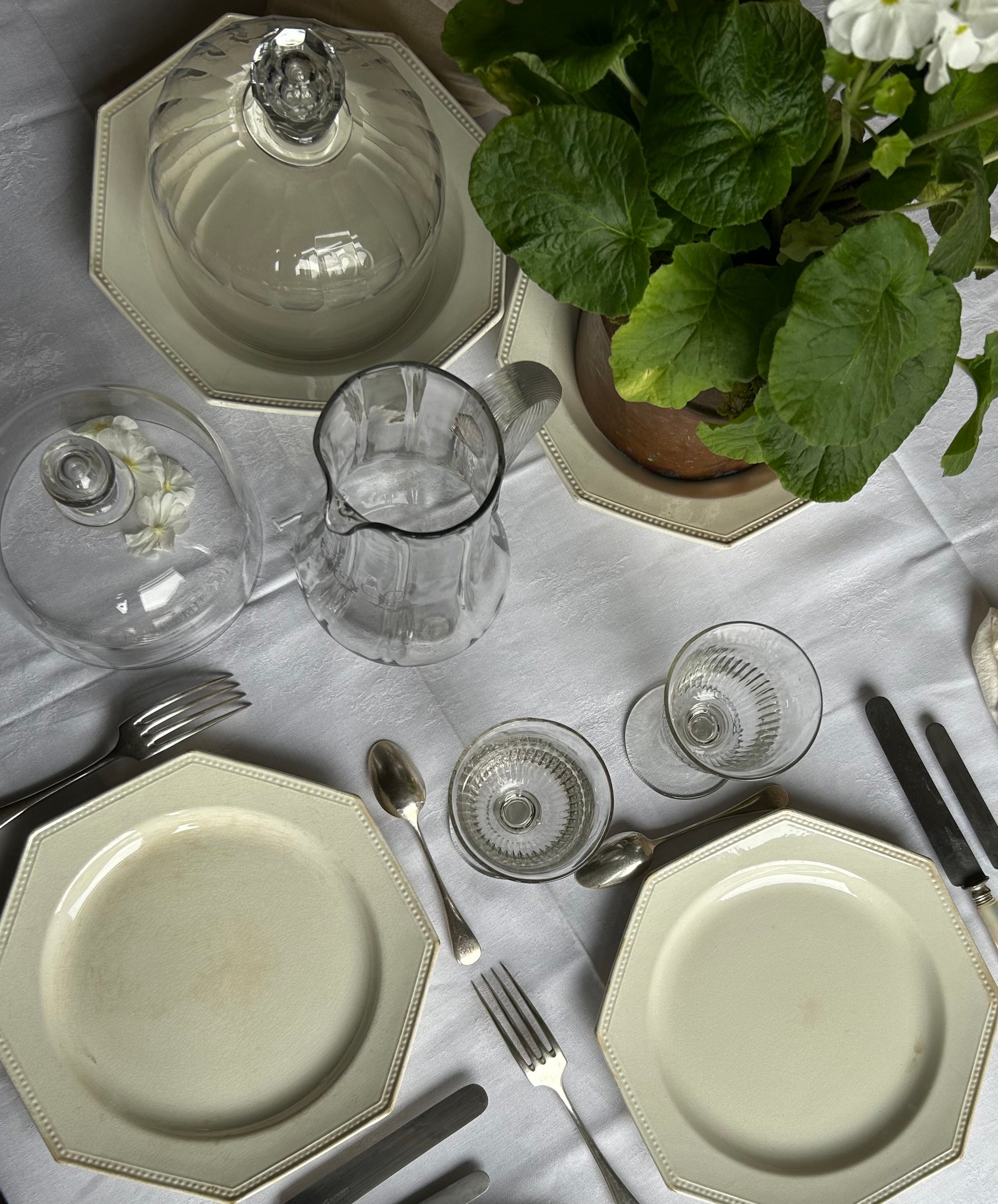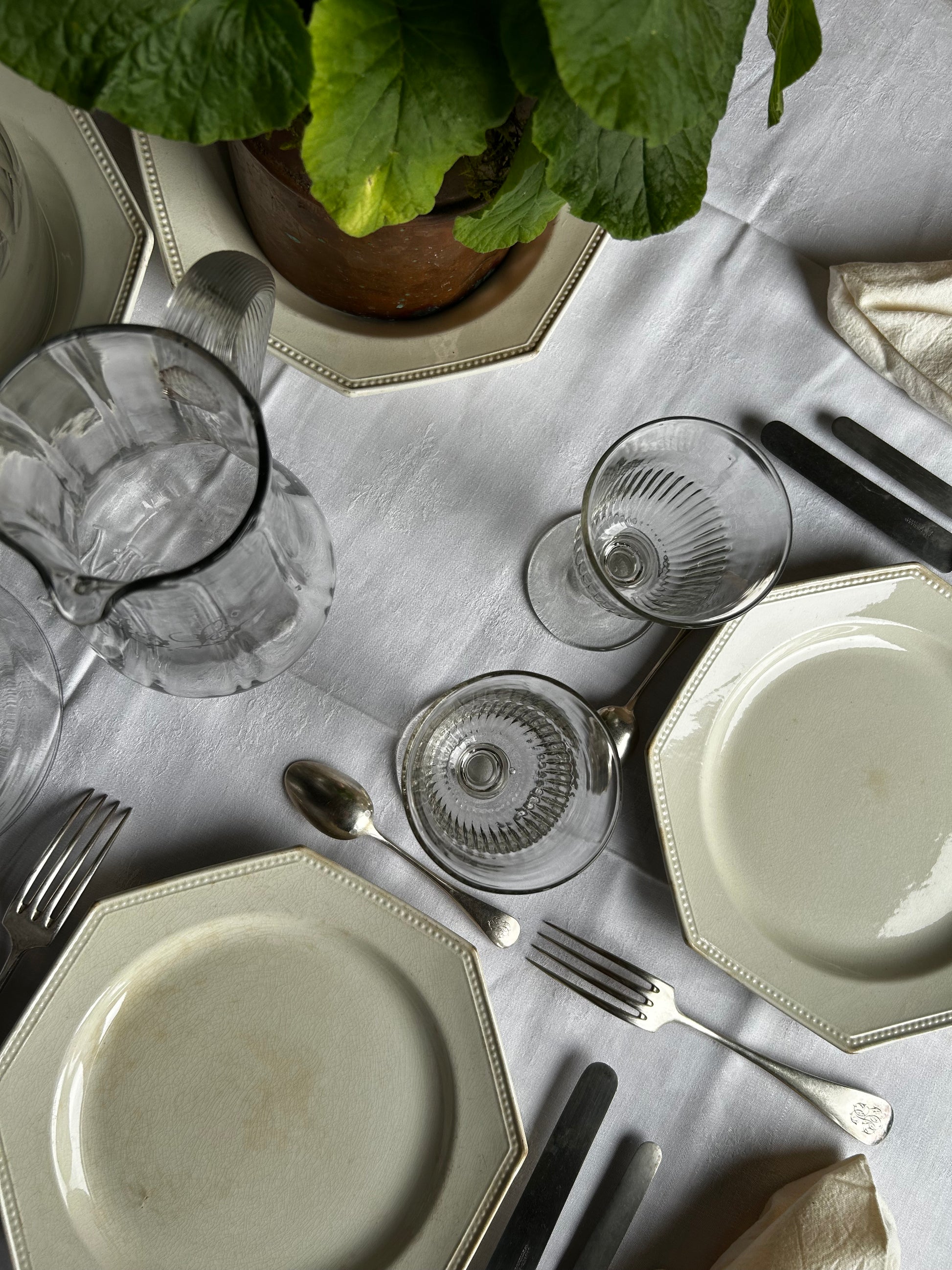 Assiette octogonale en faïence de Creil & Montereau, XIXe siècle, modèle perlé sobre et élégant, caractéristique du raffinement de la manufacture. Service ayant été utilisé, ce qui témoigne de son authenticité et de sa vie passée.